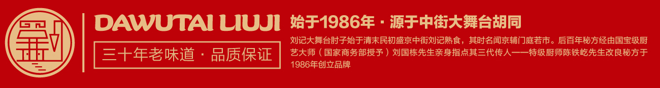 盛京,昔乃大清王朝發祥之地。劉記大舞臺肘子始于清末民初盛京中街劉記熟食,其時名聞京輔門庭若市。后百年秘方經由國寶級廚藝大師(國家商務部授予)劉國棟先生親身指點其三代傳人——中國烹飪大師劉家驥之徒中國烹飪大師陳鐵屹先生改良秘方,于1986年創立品牌。劉記大舞臺經營的產品涵蓋招牌熏肘,豬蹄,燒雞等系列,產品色澤潤嫩、酥美可口、吮指尤香、譽滿沈城,遂成古今絕味,其獨特的風味深受沈城百姓喜愛。經過三十余年的沉淀發展,劉記大舞臺品牌也成為了沈陽地標美食文化名片之一。